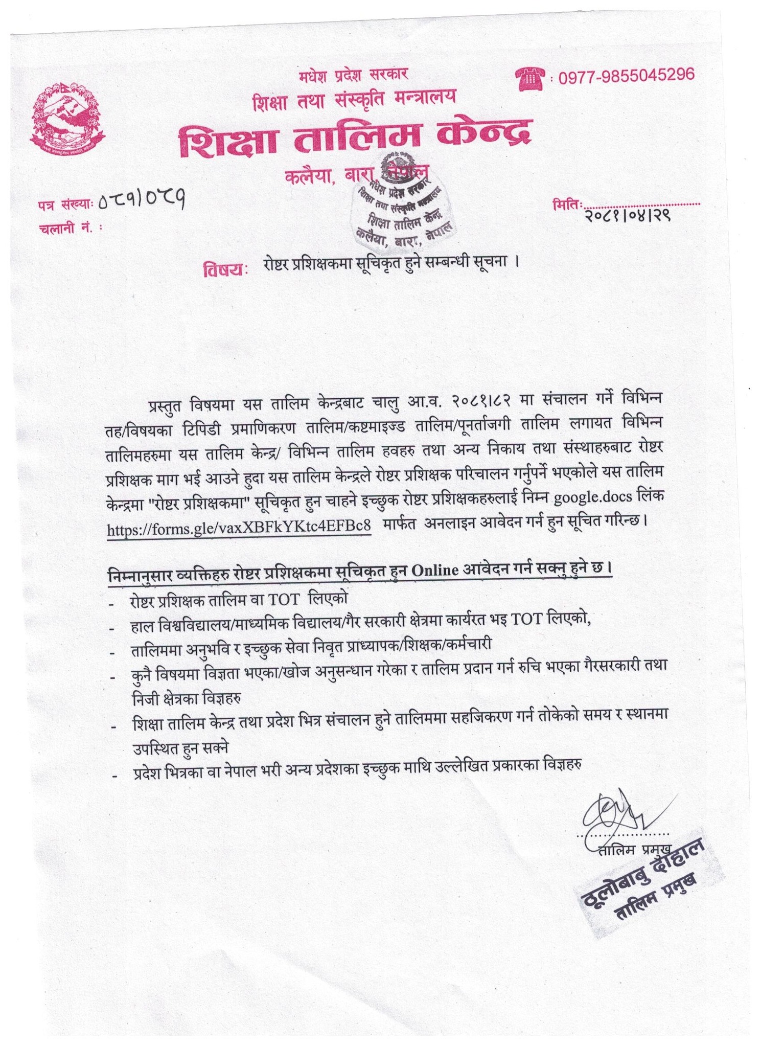 शिक्षा तालिम केन्द्र बाराको रोष्टर प्रशिक्षकमा सूचिकृत हुने आवेदन फाराम Link