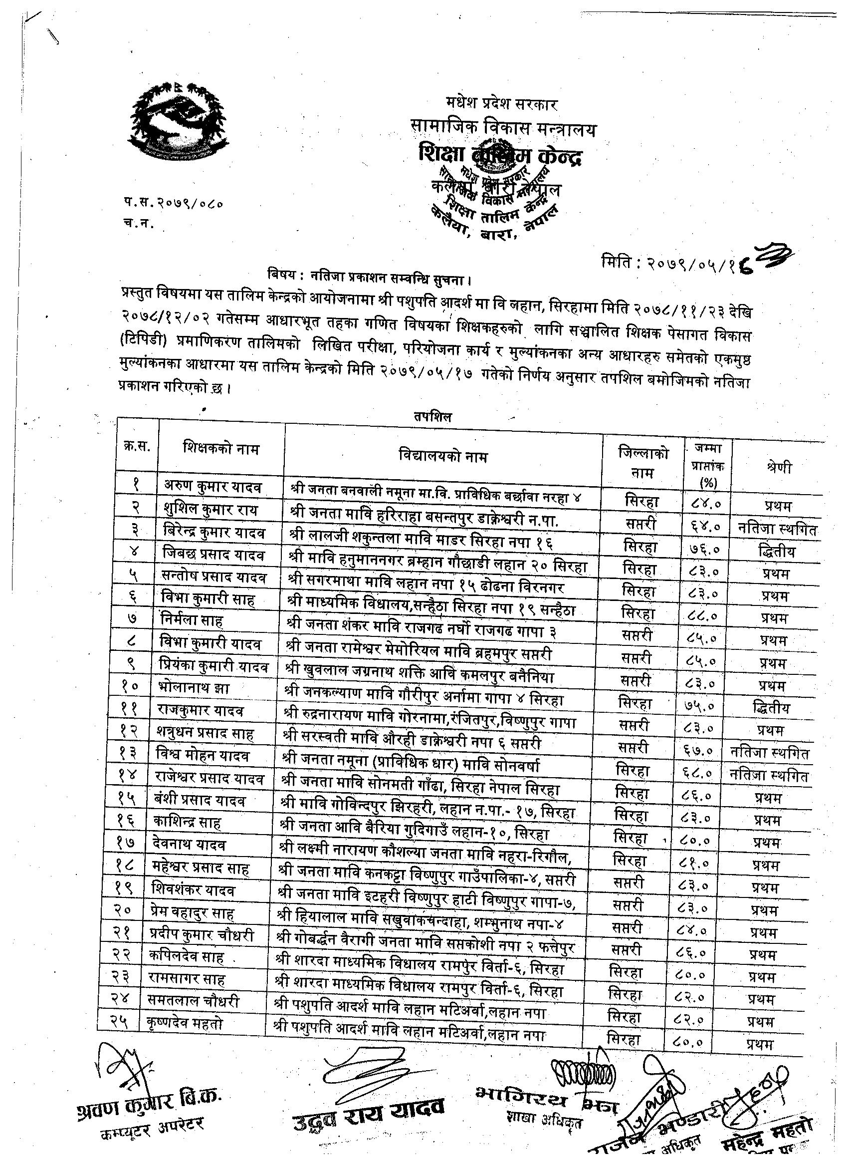 सिरहा जिल्लाका आधारभूत तह (कक्षा ६-८) गणित विषयका शिक्षकहरुको टिपिडी प्रमाणीकरण तालिमको नतिजा